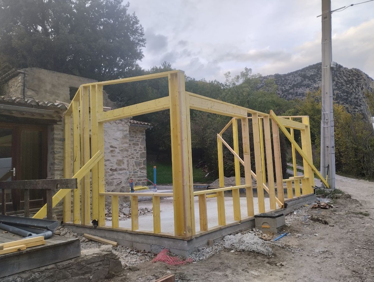 Cette extension ossature bois a été réalisée en 2022. Elle comprend des fenêtres bois, une isolation en ouate de cellulose, un bardage douglas ajouré, une couverture en plaques métalliques type joint debout Maukaline.